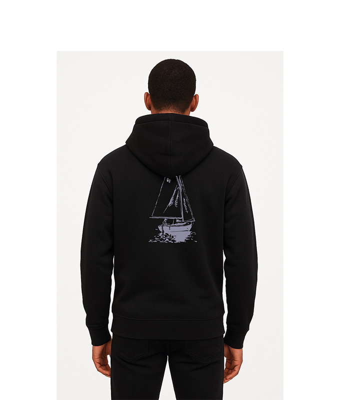 Deniz tutkunlarının vazgeçilmezi! Arka kısmında minimalist temalı ve etkileyici bir yelkenli tekne baskısı bulunan bu premium hoodie, pamuklu kumaşıyla hem konfor hem de şıklık sunar. Kapüşonlu tasarımı, ribanalı kol ve bel detayları ile günlük kullanıma mükemmel uyum sağlar. Siyah rengi ve  yelken baskısı, sade ama güçlü bir stil yaratır. Deniz, yelken ve özgürlük hissi veren bu parça, gardırobunuzun yıldızı olacak. Unisex kesim, S-XXL beden seçenekleri.